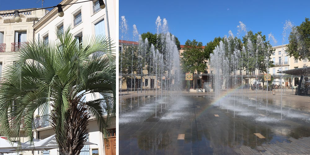 Les Allées Paul Riquet automatically leads me to the Place Jean Jaurès, which had a complete makeover in 2018. This big square is now a beautiful and spacious place where people come to flaunt. It's also the meeting point for kids to cool down and play in the fountain. No less than 50 little water spurts pop up unexpectedly to increase the fun. When the summer nights fall, the fountains put on a show with colourful lights and music. And twice a year, during the summer and Christmas period, decorations enliven the square even more.