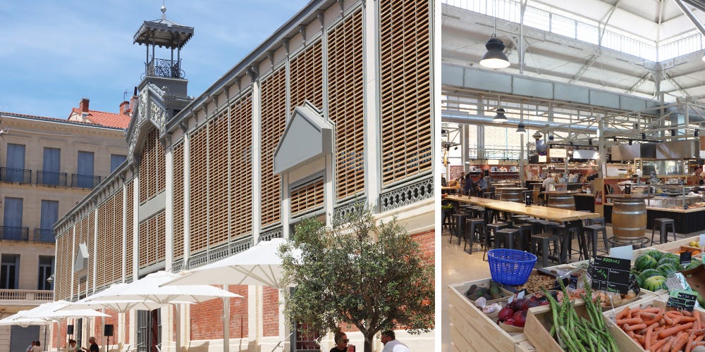 From here, I take the cobbly Rue Viennet, passing three utterly French little squares. First, the Place de la Révolution, then the Place des Bons Amis, to arrive at the Place du Forum with the town hall. These squares have many lovely bars and restaurants, but first I'm visiting Les Halles. This covered market still has its original cast-iron building in Baltard style and dates from 1891. And it has been renovated completely in 2024! Open from Tuesday to Sunday (so closed on Mondays), it's a fantastic place to find local produce and have a bite and/or drink. Although it isn't as extensive as Narbonne's covered market, you can still find an excellent selection of seafood, cheeses, meat and vegetables. There are several restaurants in and around Les Halles, so it also makes a great stop for lunch.