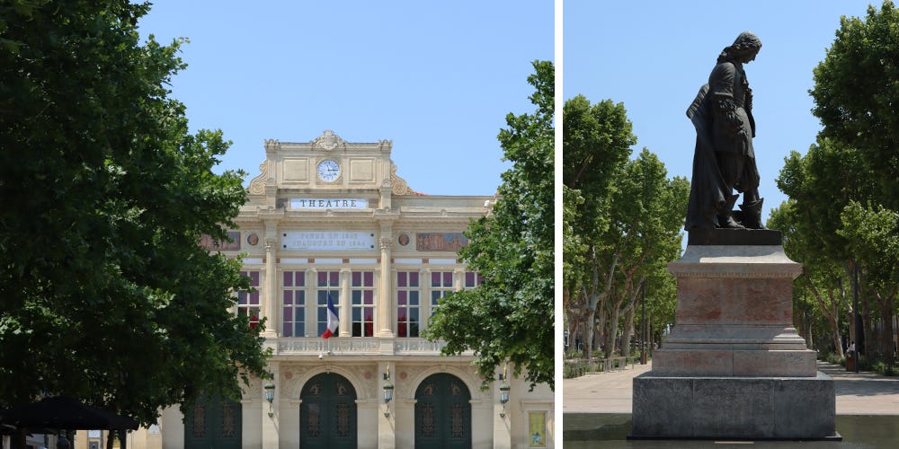 From the Place de la Madeleine, I stroll to Les Allées Paul Riquet. This boulevard is named after Béziers-born Pierre-Paul Riquet, the creator of the Canal du Midi commissioned by King Louis XIV. Since 1681, the 240 kilometres long waterway connects the Mediterranean Sea with Toulouse. On one end proudly stands Béziers' Municipal Theatre in Italian style, dating from 1844. And on the other side, you will find the city park of the Plateau des Poètes. All this under the watchful eye of Pierre-Paul Riquet's statue.
