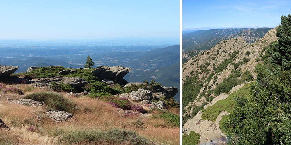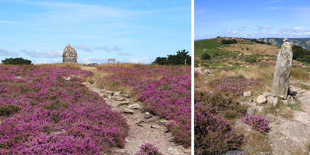 When driving land inwards from Béziers toward Saint-Chinian or Roquebrun, chances are high that you will see the impressive Mont Caroux in the distance. Caroux comes from the Occitan’ Lo Cairosus’, which means ‘the stone’. Its recognisable shape is visible as far away as the Mediterranean Sea, serving as a landmark for sailors. The mountain is in the Massif Central, where you can do great hikes. This time, Chéri and I decided to climb the summit in full summer when the slopes are covered under a purple heather blanket.