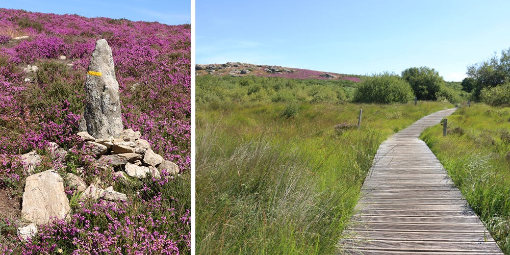 After fully having indulged in the view, Chéri and I went back to the track by following the yellow signs. Walking through a changing landscape, we unexpectedly found ourselves in the middle of peatland. I love walking on boardwalks, I don’t know why, and here they were, right in front of us! It was only a small part, but still, I enjoyed this change of scenery. La Tourbière, as peatland is called in French, is quite rare in the Haut-Languedoc Natural Park, only less than 1 % of its territory. If lucky, you might encounter local animals like mouflons, roe deer and wild boars. From here, the abundantly flowering heather marked the path to the summit of Mont Caroux.