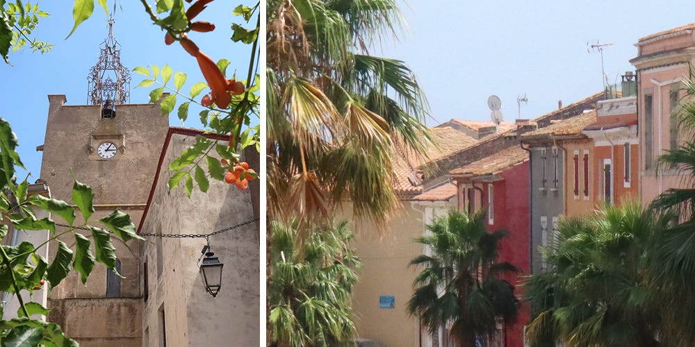 While staying at La Palme, Chéri and I had a morning ritual of getting fresh bread for our breakfast. On our way to the boulangerie, we liked to walk via the Grand Rue lined with palm trees and colourful facades. And on our way back, we passed under the clock tower, which used to be one of the gateways to enter the fortified village. It surprised us to see that La Palme- with less than 2,000 inhabitants- has several excellent shops and restaurants. Beer can be bought at the local brewery Brasserie 5Bis, and Domaine Mamaruta has great organic wines. Restaurant-wise, we loved going to L’Echo des Saisons and La Pacheyrasso near the salt marshes.