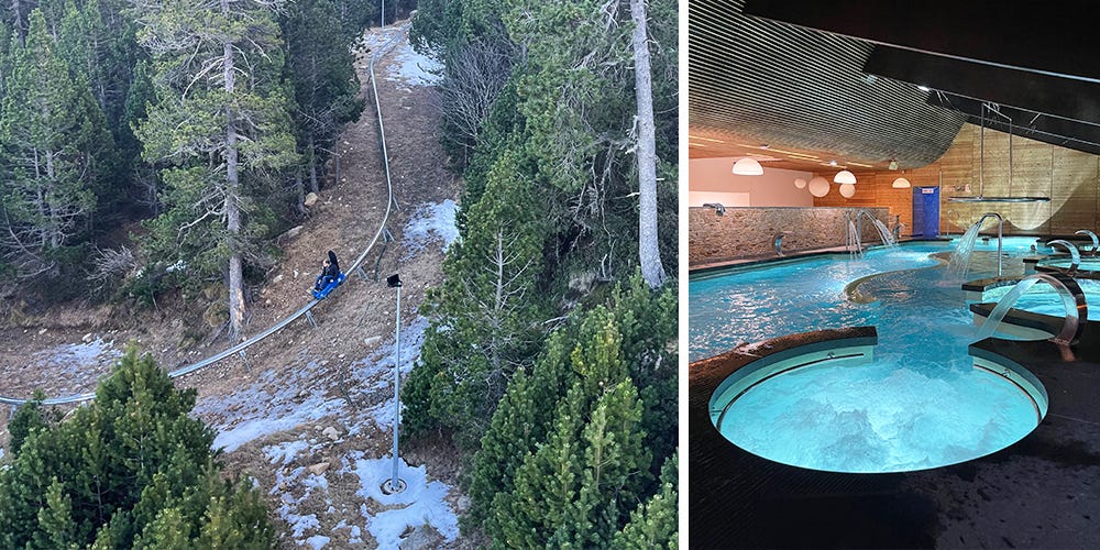 At around 14h00, the snow condition went downhill, and we called it a day. Well, not quite as I had some more surprises in store. I was so glad to have already bought these surprise tickets via Hotel Le Bel Angle, which made it extra easy. So, after returning Middlest’s skis, we went back up by the telecabine for the first surprise: a sledging ride at Lou Bac Mountain. This 2,000 metres toboggan run is attached to a monorail and descends 430 metres. Great fun! And after all this action, Middlest and I spent some time bubbling and relaxing at the second surprise: the Angléo spa. What a blissful way to end our Pyrenees weekend!